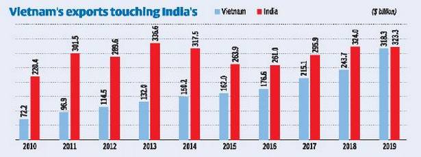 Tổng xuất khẩu hàng hóa của Việt Nam tăng trưởng với tốc độ trung bình hàng năm là 18% trong 10 năm qua cho đến năm 2019, trong khi Ấn Độ chỉ là 5%. Trong khi Việt Nam bắt đầu xuất siêu, thì mức nhập siêu của Ấn Độ đã tăng lên 156 tỷ USD vào năm 2019.