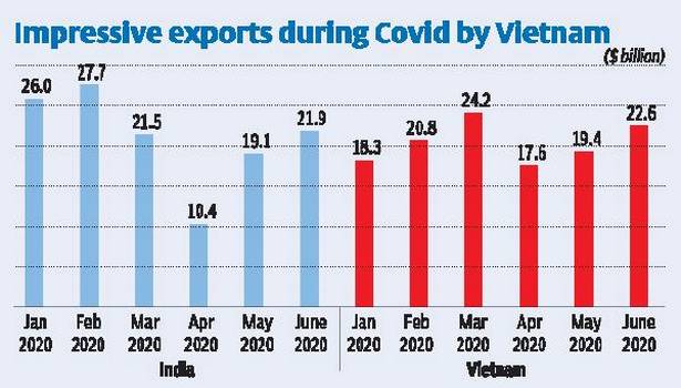 Trong 6 tháng đầu năm 2020, giữa lúc Covid-19 tàn phá, xuất khẩu từ Việt Nam gần như ngang bằng với Ấn Độ. Trên thực tế, xuất khẩu của Việt Nam trong năm nay vẫn tăng trưởng trung bình 3%, trong khi Ấn Độ tăng trưởng âm 24% trong cùng thời kỳ.